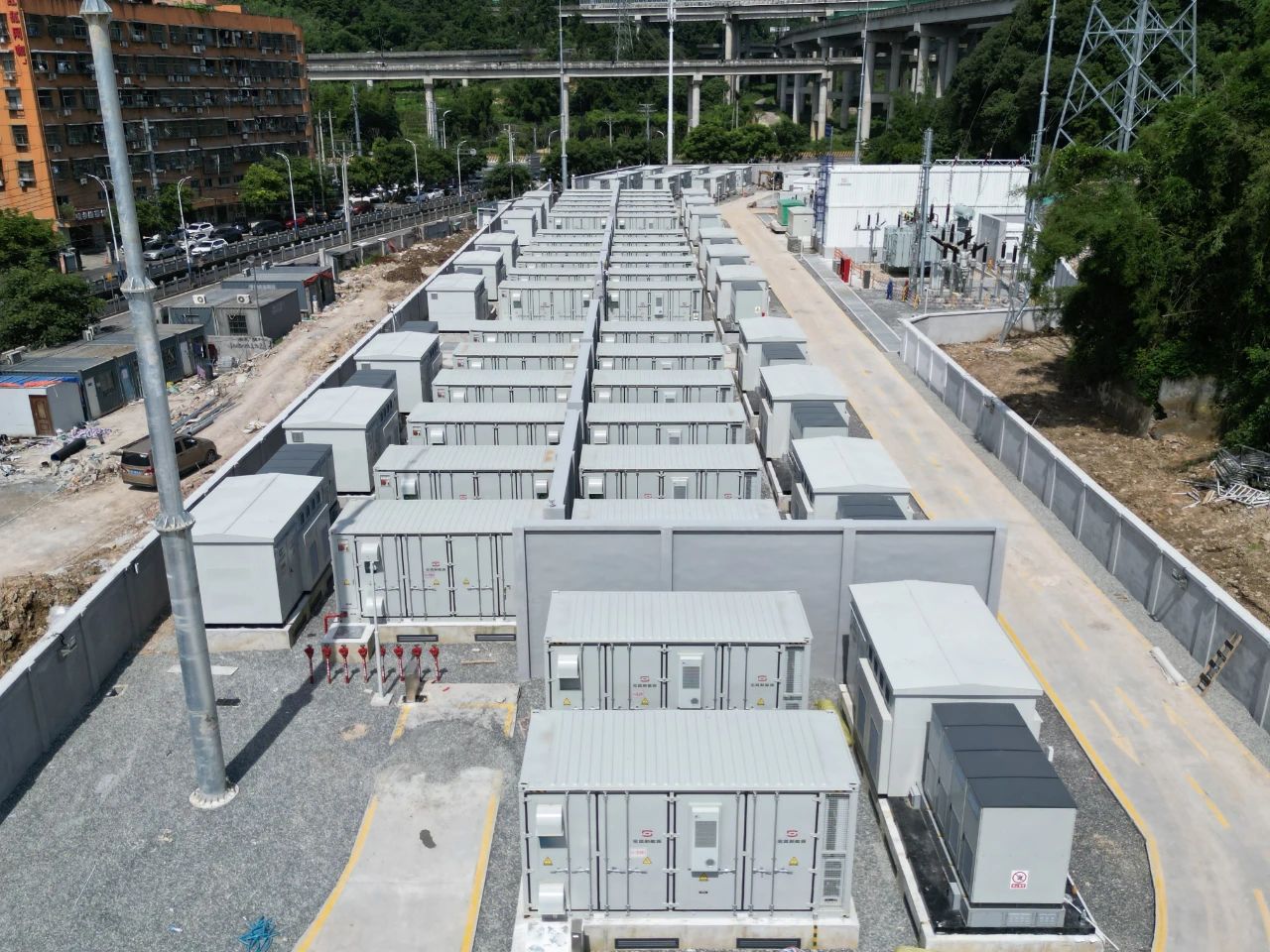 项目占地面积约8063.68平方米,在狭长的地块上布置了45套4.472MWh的储能电池舱、22套4.5MW和1套2.25MW储能交流升压一体机,外加一座110kV升压站。