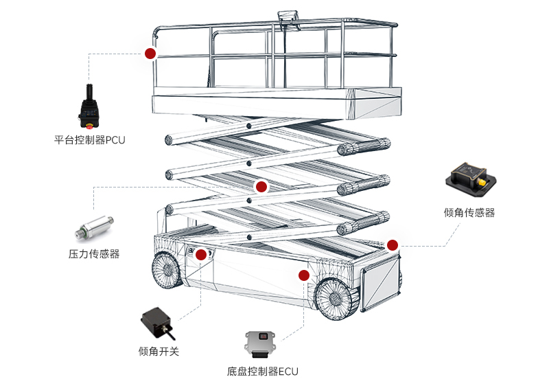 剪叉式高空作业平台可实现平台、底盘双向行走升降,高低速控制功能等,具备防护功能以及高度、重量实时监测反馈功能。系统ECU、PCU均配置大显示屏,可实时显示车速、高度、重量等信息,操作舒适、安全可靠,大大增加了系统适配性,维护成本降低。