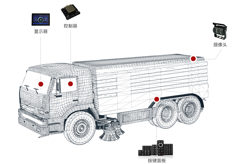 清扫车电控系统集报警、视屏监控、状态监控于一体,集成化程度高,可对数据互联、智能化管理功能进行扩展,功能丰富,操作智能、方便、安全。